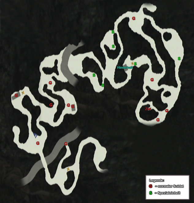 Die nachfolgende Aufgabe ist nicht unbedingt sehr schwierig gehalten, ihr müsst hierbei theoretisch den Fußspuren folgen. Um euch das ganze zu erleichtern haben wir eine Karte angefertigt auf der alle Feinde eingezeichnet sind, sowie euer eigentliches Ziel. Ihr könnt nun selbstständig entscheiden welche Route für euch die beste ist, natürlich solltet ihr die diversen Sackgassen und Hinterhalte der Feinde eher meiden, auch wenn es dort des Öfteren einige nützliche Gegenstände zu finden gibt. Die normalen Soldaten sind auf der Karte als ein rotes „G“ eingezeichnet, Mitglieder der Spezialeinheit erkennt ihr als grünes „S“. Die gelben X Markierungen stellen eine Sackgasse dar. Wenn ihr es nicht zu eilig habt solltet ihr am besten das komplette Gebiet genau erforschen da es einige nützliche Gegenstände sowie Waffen zu holen gibt. Dort wo ihr den roten Schriftzug „Ziel“ sehen könnt befindet sich der Ausgang aus diesem Gebiet.