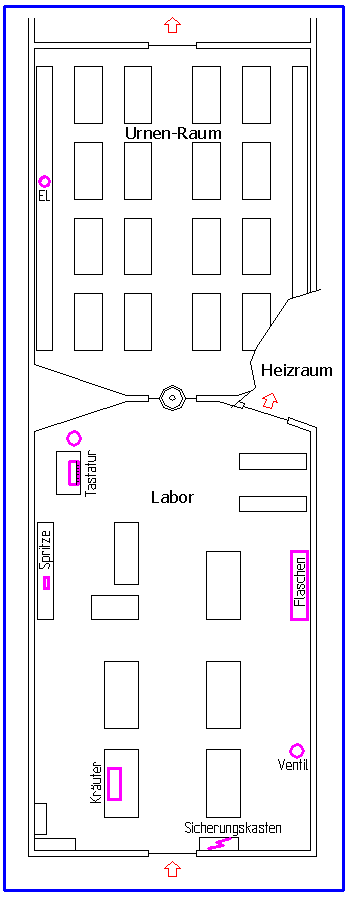 Erst jetzt lässt sich der kleine Sicherungskasten anschauen (Lupensymbol des Mauscursors) und öffnen, der auf dem Rückweg zur Eingangstür links an der Wand befestigt ist. Der darin befindliche Hebel wird umgelegt, es wird hell und endlich erkenne ich, dass ich mich in einem Labor befinde.