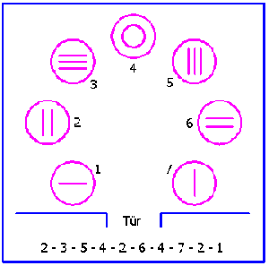 Wir haben die Säulen gedanklich von 1- 7 (von links nach rechts) durchnummeriert, wenn ihr mit dem Rücken zur verschlossenen Tür steht.