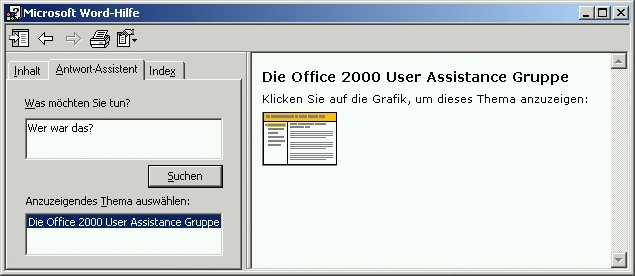 Falls der Assistent nicht aktiv ist (die Büroklammer-Figur rechts unten), wählen Sie ?/Office-Assistenten anzeigen. Klicken Sie den Assistenten an, schreiben Sie "Wer war das?" in das Textfeld, und klicken Sie auf "Suchen". Klicken Sie das Suchergebnis "Die Office 2000 User Assistance Gruppe" an. Es öffnet sich das Hilfe-Fenster. Klicken Sie auf die Grafik rechts oben, um die Credits zu sehen. Das läßt sich weniger leicht erklären als ausführen.