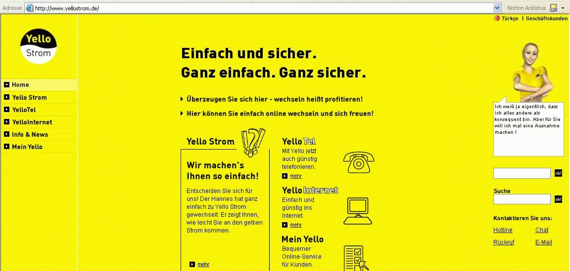 Auf www.yellostrom.de ist rechts oben in der Ecke Eve, die virtuelle Mitarbeiterin von Yello Strom, zu sehen. Geben Sie im Feld "Ihre Frage" den Text "zieh dich aus" ein. Eve wird sich kurz enthüllen. Daraufhin können sie "nocheinmal", und dann "bitte" eingeben. Eve hat übrigens auf eine Vielzahl von Eingaben schlagfertige Antworten.