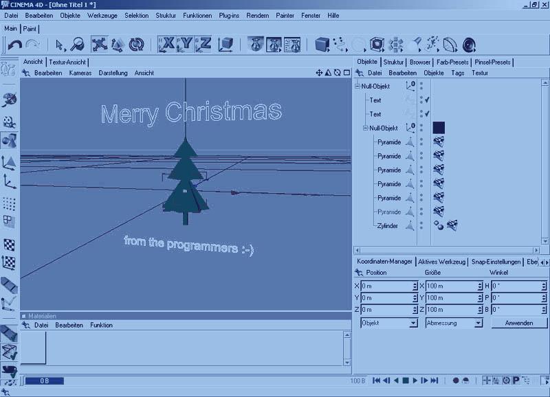 Stellen Sie das Datum ihres PCs auf den 25.12. Starten Sie das Programm wie gewohnt. Anstelle eines leeren Dokuments wird ein 3D-Tannenbaum plus Weihnachtgruß geöffnet.