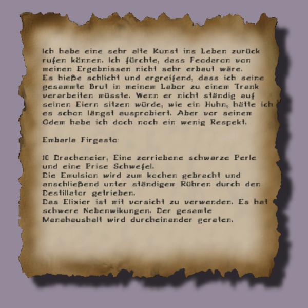"Ich habe sogar mal einen Trank gebraut, der die Kampffähigkeiten permanent erhöht. Allerdings fand dieses "Meisterwerk der Alchemie" bei diesen Deletanten auch wenig Begeisterung. Sie wissen mein Genie einfach nicht zu schätzen."