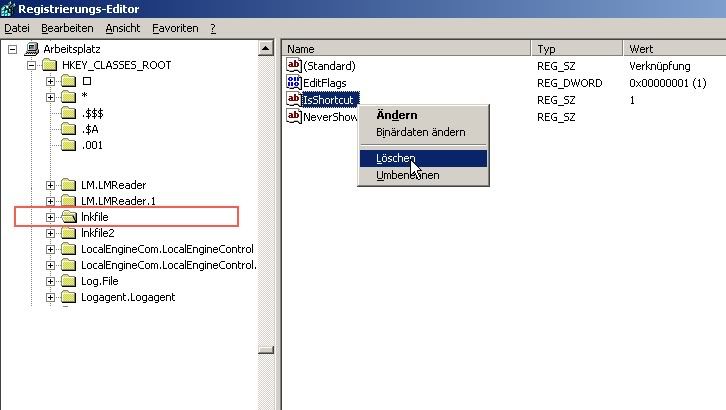 Suche und markiere in der rechten Fensterhälfte den Eintrag IsShortcut und lösche ihn einfach raus.