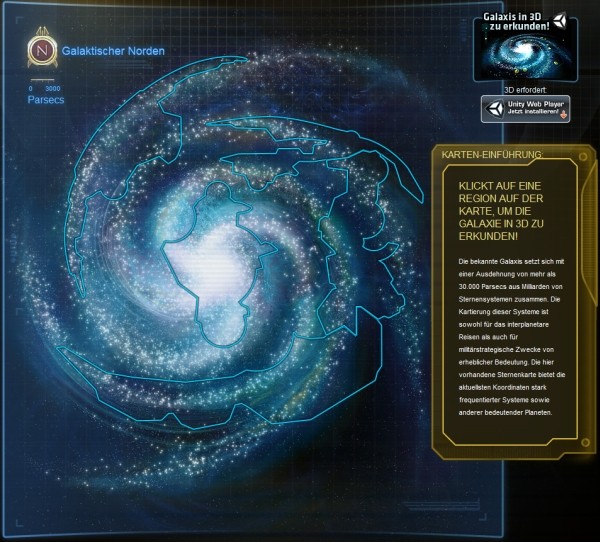Dabei handelt es sich um eine interaktive Sternenkarte, die die fünf großen Sektoren der bekannten Galaxis beinhaltet. Damit kamm man sich unter anderem die ausführlichen Profile einzelner Planeten ansehen oder Modelle der Spieler-Raumschiffe betrachten.