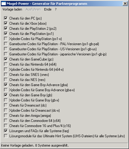 Da Sie im Idealfall für jeden Buchstaben eine eigene HTML-Seite generieren, benötigen Sie für jedes System 27 (A bis Z und Ziffern) Einzelseiten. Bereits bei einigen Plattformen müssen rund 100 Seiten bearbeitet werden. Eine spezielle Software unterstützt Sie dabei: Sie erstellen eine HTML-Vorlage, in die Sie §N als Platzhalter für den Systemnamen, §T als Platzhalter für den System-Typ (wie 1 für PC) und §B als Platzhalter für den Buchstaben eintragen. Sie starten unser Generator-Programm, laden die Vorlage, wählen die gewünschten Systeme aus, und innerhalb weniger Sekunden werden je System 27 Einzelseiten erstellt.
