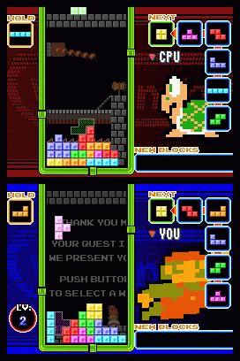 Je nach Modus tummeln sich auf dem zweiten Bildschirm beliebte Nintendo-Figuren wie Mario, wird das nächste Teil angezeigt, beide Screens zeigen ein zusammenhängendes Spielfeld, oder man sieht die Puzzles der Gegner.
