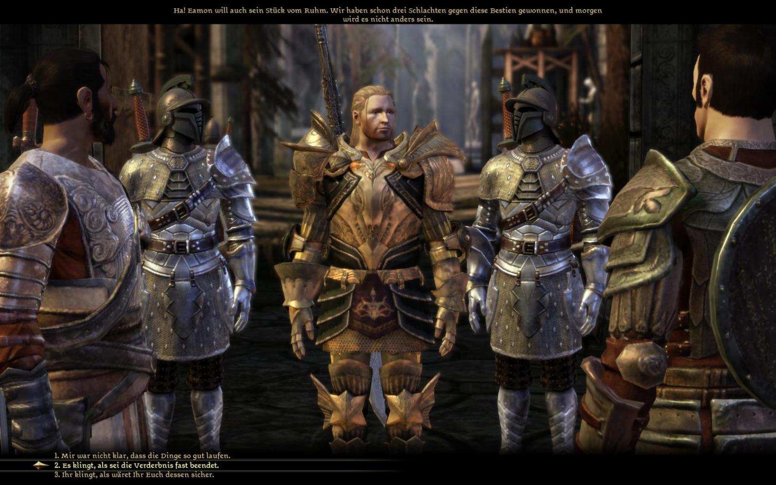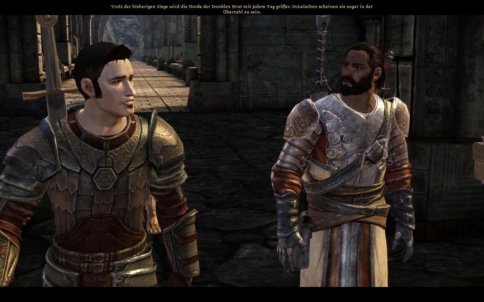 Das Spiel erzählt eine immer wieder überraschende und fesselnde Geschichte. Dragon Age könnte man auch so beschreiben, als ob es die sehr guten Charakterbeziehungen aus Baldurs Gate, die Levels von Neverwinter Nights und die Spannung von Herr der Ringe aufsaugte. Das Spiel bietet eine lange Geschichte. Und durch die verschiedenen Charaktermodelle, wird diese immer wieder etwas anders erzählt.